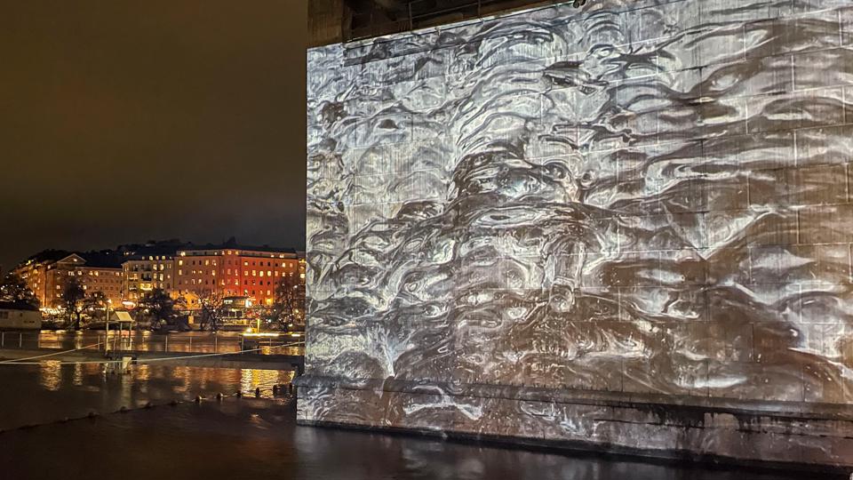 Videoinstallationen Aquasendence förvandlar Liljeholmsbrons mäktiga bropelare till levande filmdukar. Verket är skapat av konstnär Tina Johnsson med musik av Ossian Reynolds.