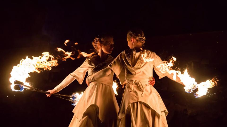 Kom och titta på en eldshow med Eldshowskompaniet Aurora, fylld av rytm, ljus och rörelse!